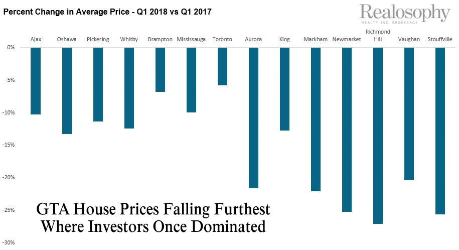The chart shows that homes lost value in Toronto, the least (about 7%) and in Richmond Hill, the most (over 25%). The study compares these prices to similar time last year.
